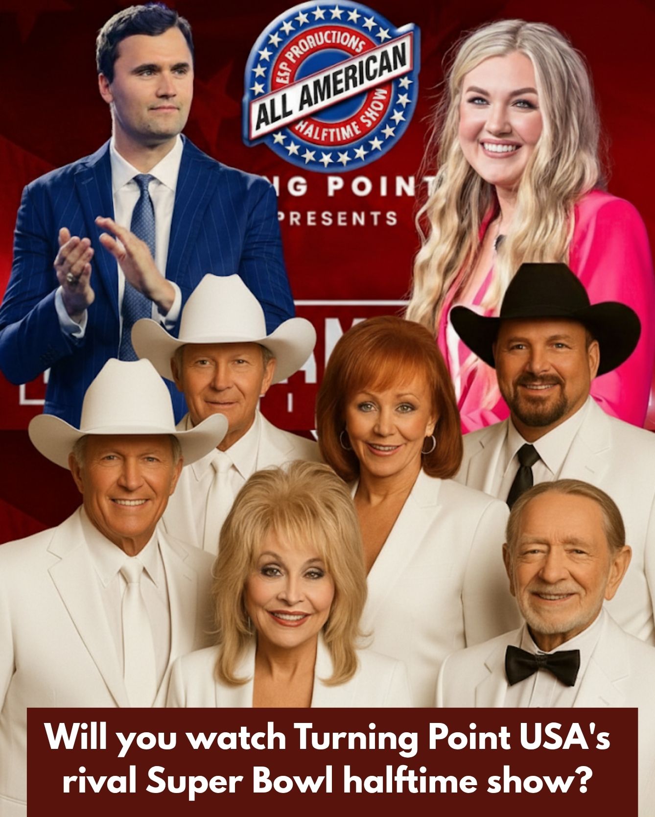 The “All-American Halftime Show,” produced by Erika in memory of her late husband Charlie Kirk, has already drawn global attention for its lineup of iconic country artists — including George Strait, Dolly Parton, Reba McEntire, Willie Nelson, and Alan Jackson — and for its message of faith, family, and freedom in contrast to the increasingly commercial tone of the Super Bowl spectacle.
